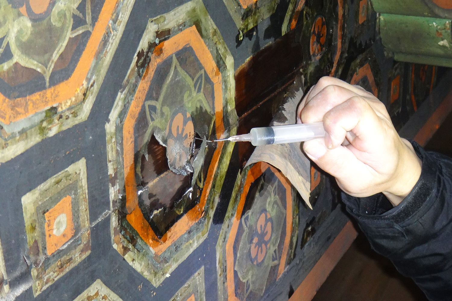 一般的に漆塗や彩色の剥落止めには元々使われている同じ素材(漆や膠、布海苔などの天然由来の接着剤)を使用します。塗り重ねられた塗装面同士や塗装面と支持体の間といった剥離箇所に接着剤を差し込み、または浸透させる作業となるため、塗装を理解し劣化の状態を観察して、何処までどの程度の剥落止めをするかの慎重な調査検討と適切な材料や技法を選択する必要があります。