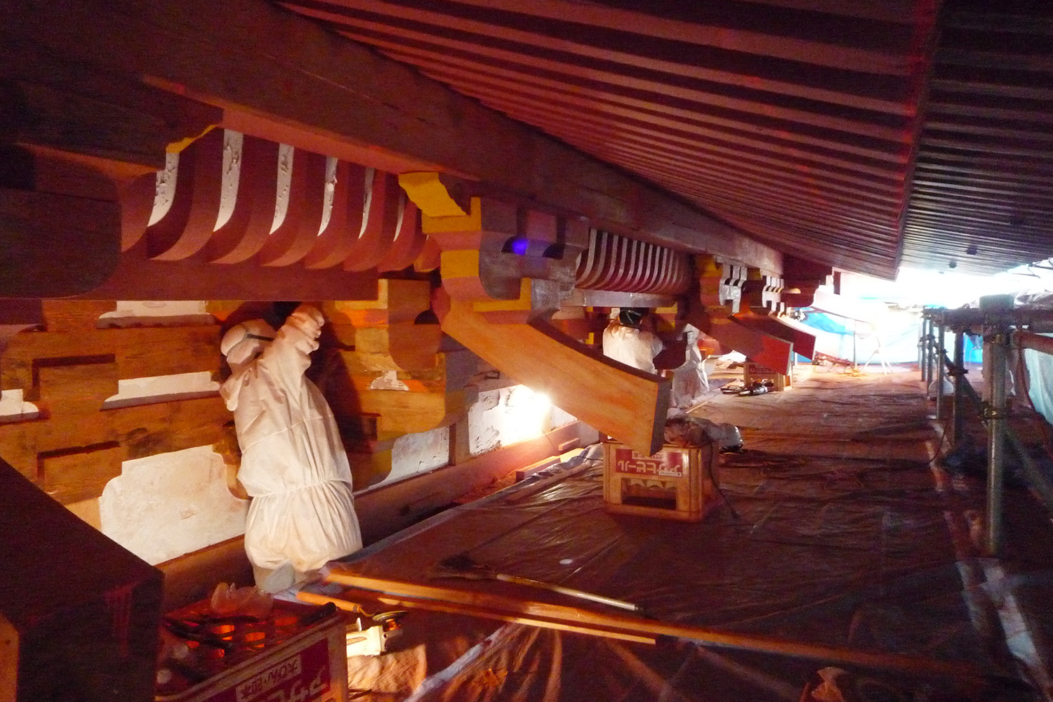 弊社では、膠に関する知識と扱いに最も精通している技術者が修理を担当し、各地の歴史的背景や土地柄が反映された独自の「丹」色が、訪れる方々の目に鮮やかに焼きつけられてゆくことを心がけ、作業にあたっております。